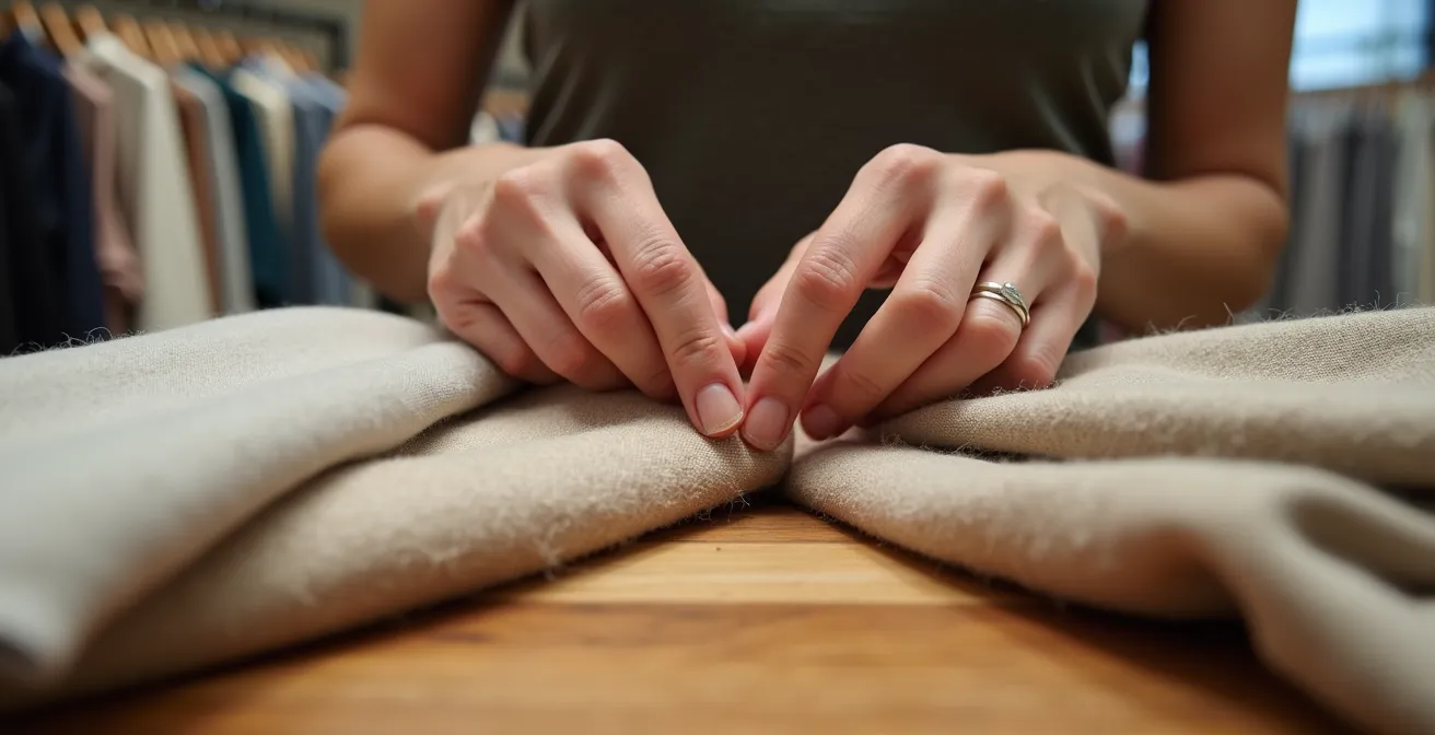 La sabiduría popular nos dice que miremos las costuras, que revisemos los botones o que leamos la etiqueta de composición. Son consejos válidos, pero superficiales. Son como juzgar un libro por su portada. Como controladora de calidad textil, mi trabajo consiste en ir más allá de lo evidente. Pero, ¿y si te dijera que la etiqueta miente a menudo y que tus propias manos son el laboratorio de calidad más fiable que existe? La verdadera calidad no se anuncia, se siente. El «carácter» de un tejido, su firmeza, su capacidad para volver a su ser tras el estrés… eso no aparece en ninguna etiqueta de poliéster o algodón.
