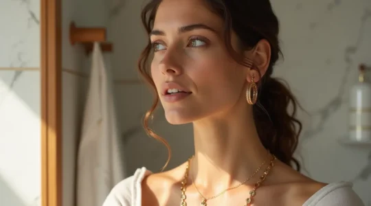 El estilismo de escote es fundamental: un escote en V alarga el cuello y se complementa bien con collares en forma de Y o cadenas largas, mientras que un escote barco pide piezas más cortas tipo gargantilla. Si tienes un cuello largo, puedes permitirte capas y chokers; si es más corto, las cadenas de longitud media (40-50 cm) crean una ilusión de alargamiento. Observa también el ancho de tus hombros: pendientes anchos equilibran hombros estrechos, mientras que diseños verticales estilizan.